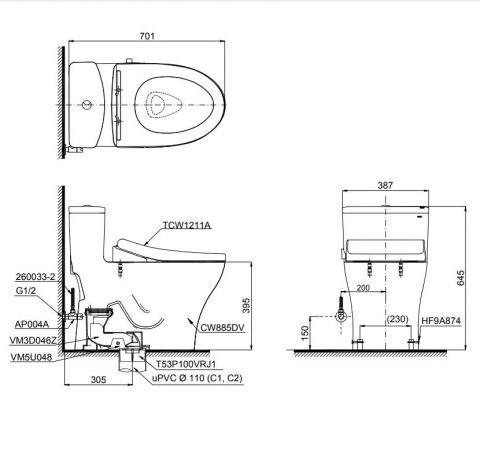 Bản vẽ kích thước bàn cầu TOTO MS885DE4