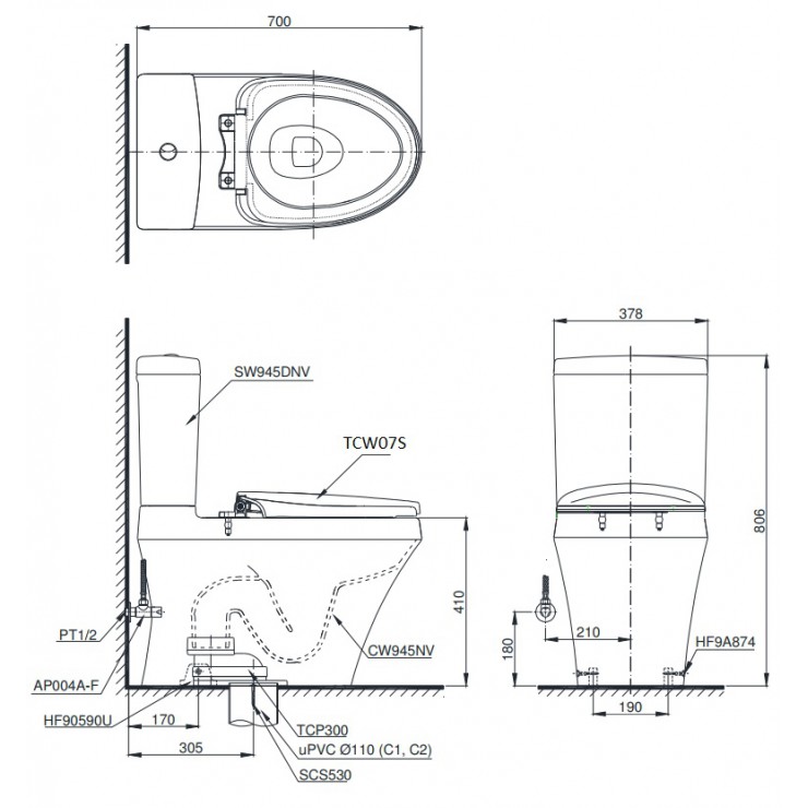 Bản vẽ bồn cầu CS945 nắp rửa cơ TCW07S TOTO