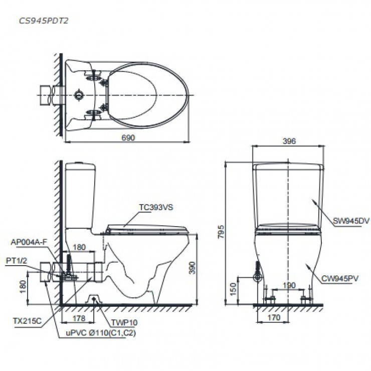 Bản vẽ kĩ thuật bàn cầu TOTO CS945PDT2 thoát ngang