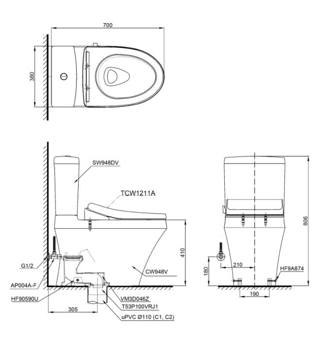 Bản vẽ bồn cầu CS948 nắp rửa cơ TCW1211A TOTO