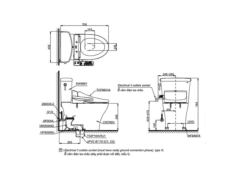 Bản vẽ kích thước bồn cầu điện tử TOTO CS986GW17
