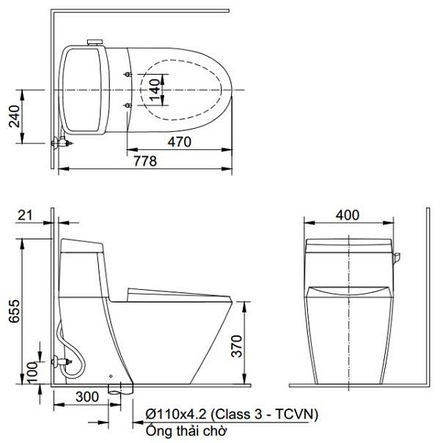 Kích thước bồn cầu: 778 x 400 x 655 mm (dài x rộng x cao)