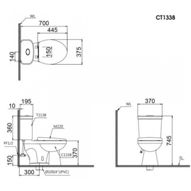 Bản vẽ kích thước bồn cầu CT1338 nắp rửa TAF050 caesar