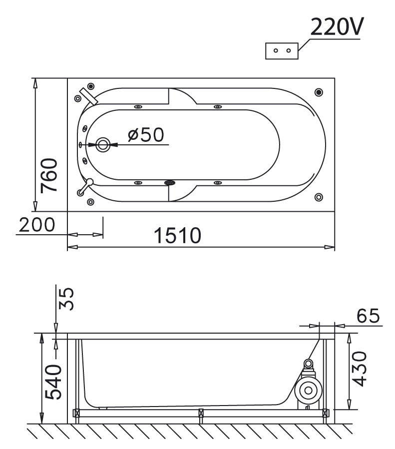 Bản vẽ kỹ thuật bồn tắm dài Caesar MT0250 1,5M