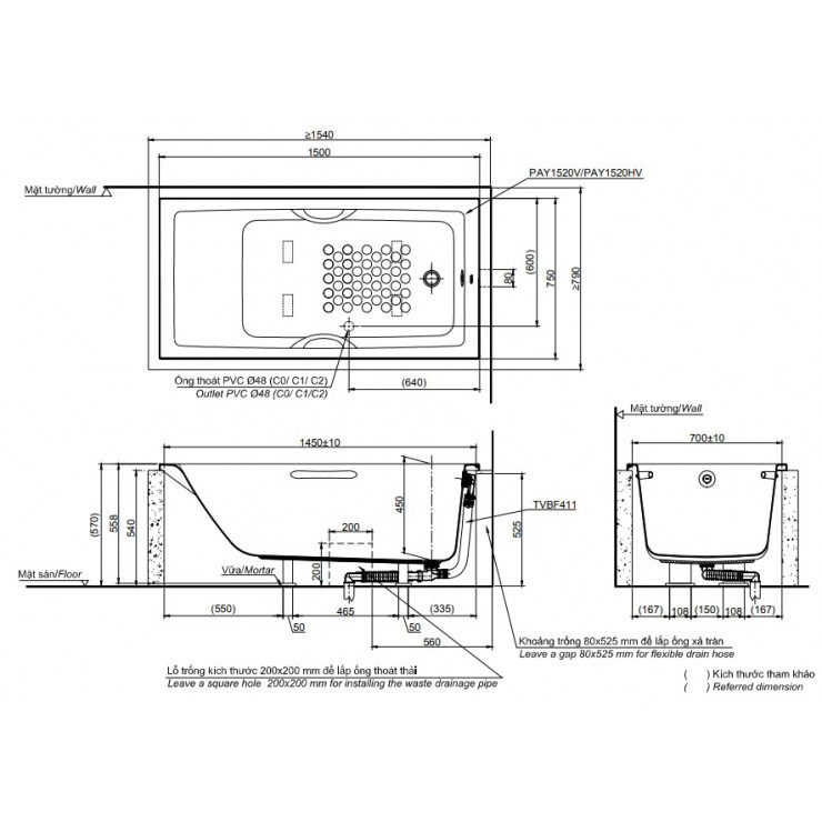 Bản vẽ kỹ thuật bồn tắm TOTO PAY1520V#W/TVBF411