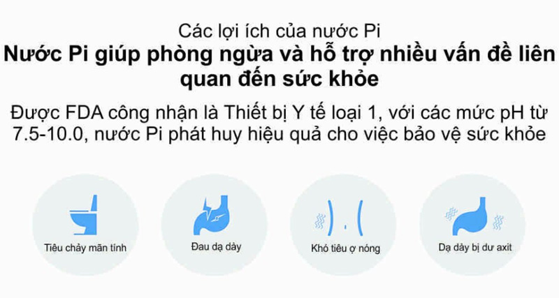 – Nước Pi Mức 1 (pH 7.5 ) nước uống dành cho người mới sừ dụng, trẻ em – Nước Pi Mức 2 (pH 8.5 ) nước uống hằng ngày – Nước Pi Mức 3 (pH 9.5) Dùng với mục đích nấu ăn. Uống hàng ngày, thải độc rượu bia, uống theo các lộ trình thải độc theo sự chỉ dẫn của bác sĩ. – Nước Pi Mức 4 (pH 10.0 – 10.5) ngâm, rửa rau củ để loại bỏ vị đắng, chát trên rau quả, dùng uống cho các bệnh nhân khi có chỉ định của bác sĩ. |